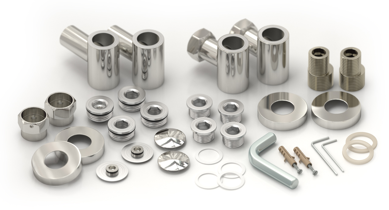 угловые элементы / спускной клапан / отражатели, эксцентрики и опоры кронштейнов / декоративные заглушки / комплект прокладок / шестигранные ключи / дюбели и саморезы